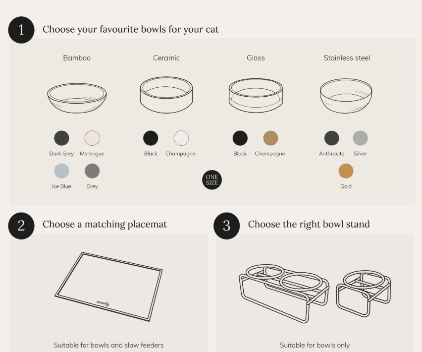 Let op: om beschadiging van de vloer te voorkomen, altijd de onderzijde van de voerbak droogmaken voordat deze op de vloer wordt geplaatst. Voor extra bescherming wordt de SERVE placemat aanbevolen.