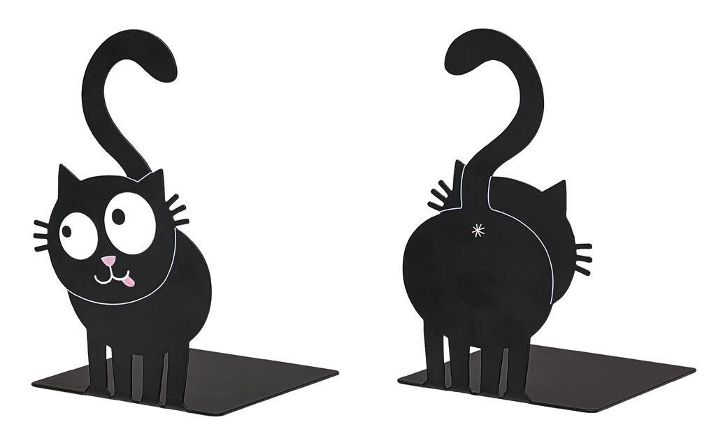 Twee prachtige boekensteunen gemaakt van metaal met uitgestanste Ed, the cat. De voor- en achterzijde van de kat. De staart krult leuk omhoog