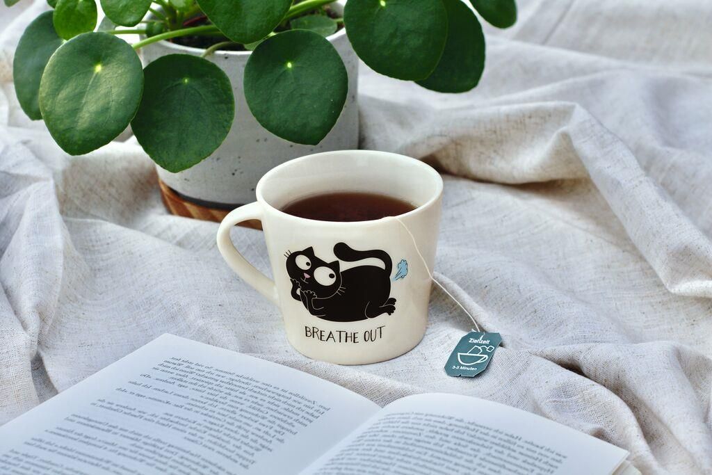 Een te grappige porseleinen mok van Ed, the cat waarin hij twee verschillende yoga poses aanneemt.