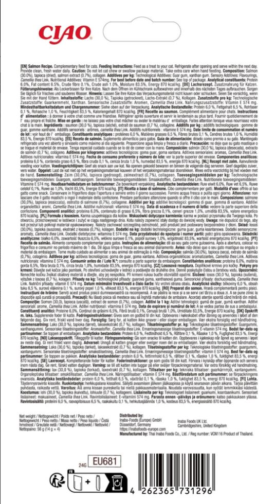 Deze heerlijke lekkernij is speciaal gemaakt om jouw kat te verwennen. Met de perfecte balans tussen smaak en structuur, biedt deze snack een onweerstaanbaar avontuur voor de zintuigen van jouw kat. De combinatie van heerlijke zalm zal ervoor zorgen dat jouw kat zijn of haar pootjes erbij aflikt.