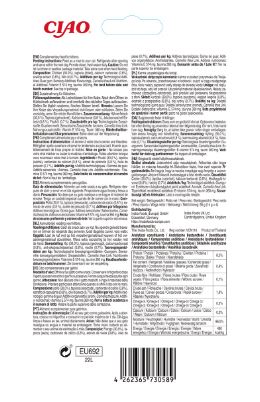 Samenstelling: Kip (30%), Tapioca (gedroogd), Calciumcarbonaat (0,8%), Sint-Jakobsschelpextract (0,8%), Visolie (0,7%)