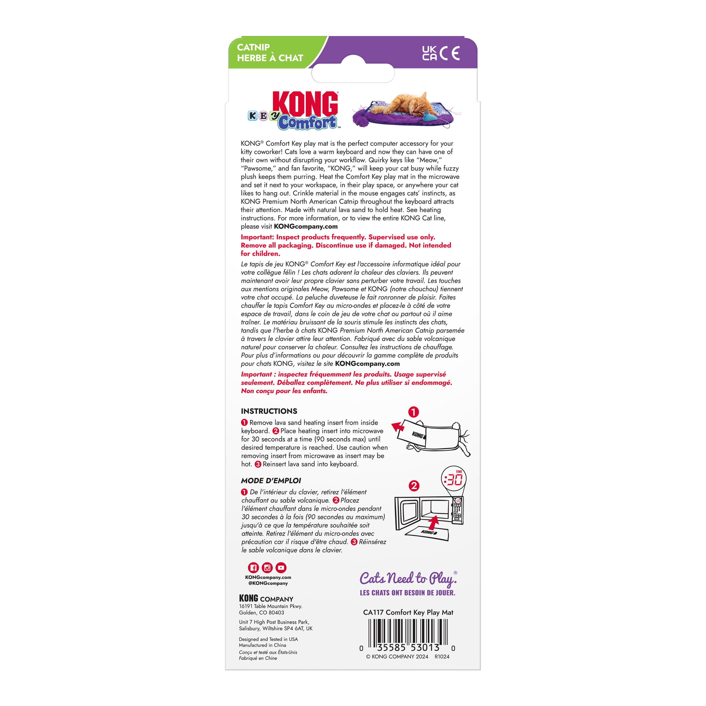 De KONG Comfort Key speelmat is het perfecte computeraccessoire voor je katachtige collega! Katten zijn dol op een warm toetsenbord en nu kunnen ze er eentje hebben zonder je werk te verstoren. Grappige toetsen zoals “Miau”, “Geweldig” en de favoriet van de fans, “KONG”, houden je kat bezig, terwijl de zachte pluche stof ervoor zorgt dat ze spinnen. Verwarm de Comfort Key speelmat in de magnetron en zet hem naast je werkplek, in de speelruimte van je kat of waar je kat ook maar graag vertoeft. Het knisperende materiaal in de muis prikkelt het instinct van katten, terwijl de KONG Premium Noord-Amerikaanse kattenkruid in het toetsenbord hun aandacht trekt. Gemaakt met natuurlijk lavazand om warmte vast te houden. Zie de verwarmingsinstructies.