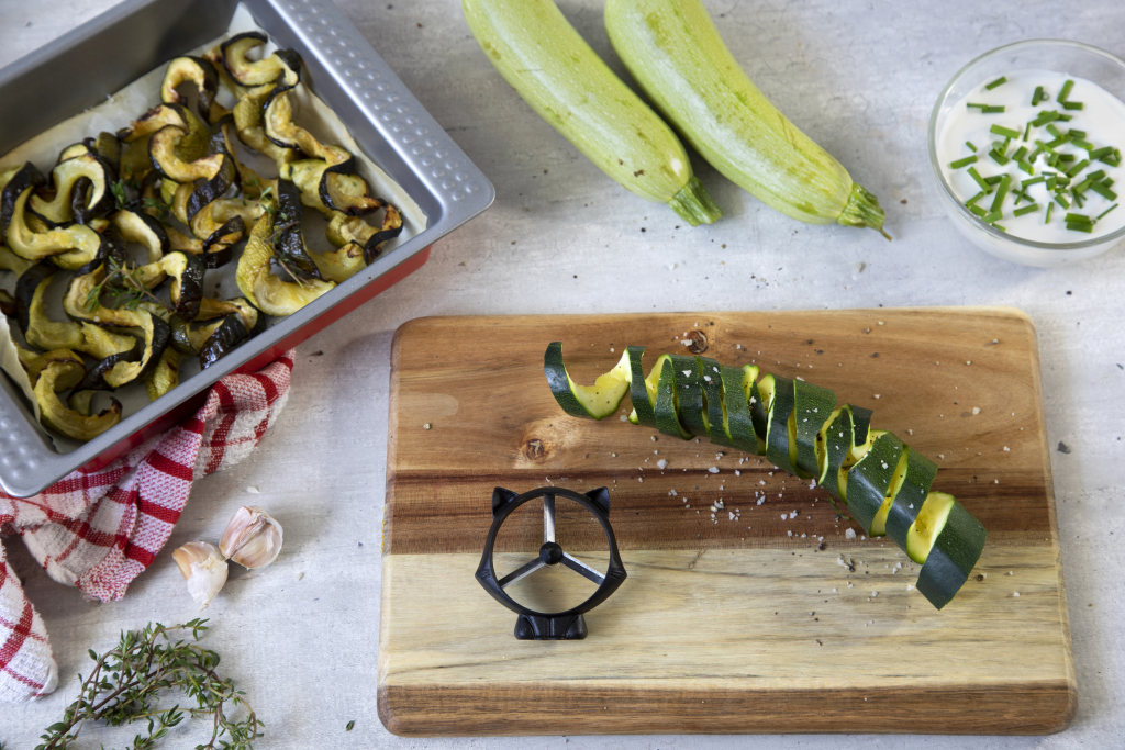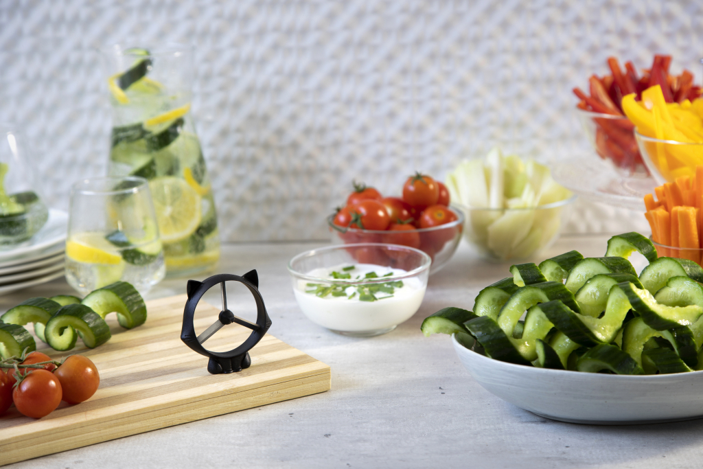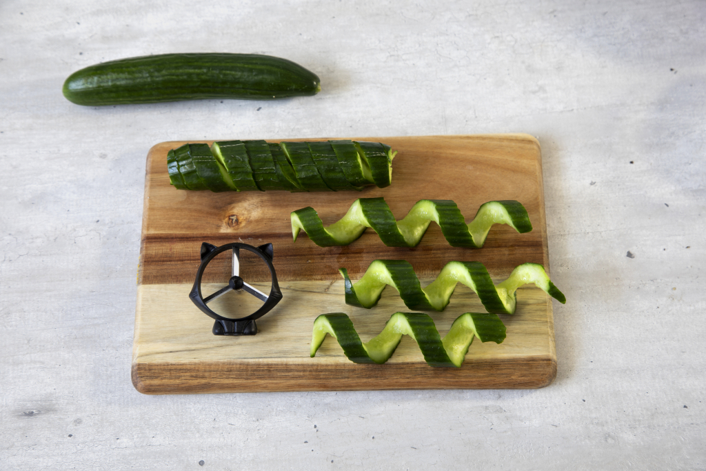 Komkommers en courgettes krul je snel met deze curly cat. Draai er een door de bladen van de curly cat en kijk hoe de magic happens! Je krijgt perfecte krullen om je bord mee te versieren of je favoriete drankje te garneren.