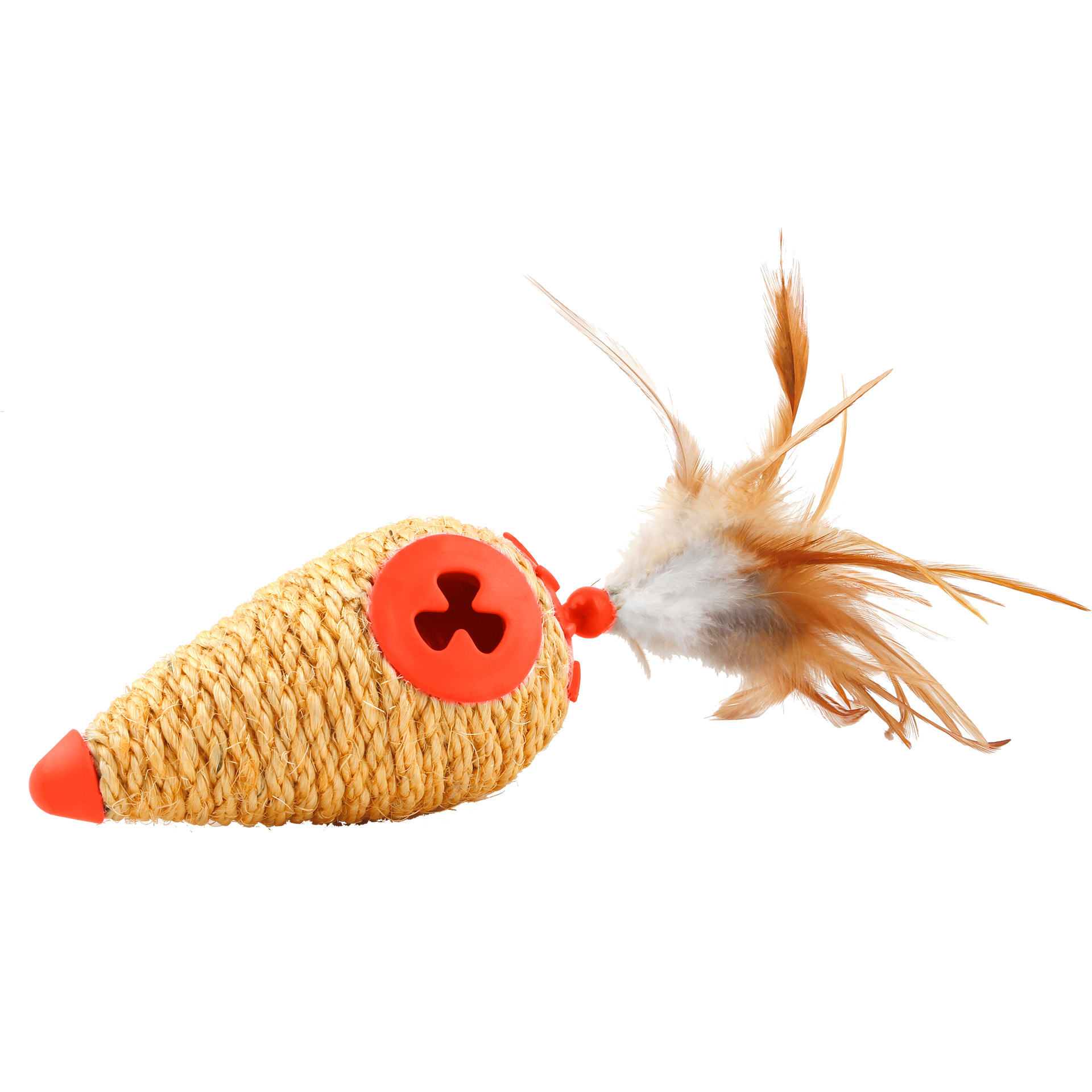 Het 3-in-1 Roll N’ Play speeltje kan gevuld worden met voer of snoepjes. Het bevat ook een binnencapsule die gevuld of bespoten kan worden met kattenkruid om het speelinstinct van je kat verder te stimuleren. De buitenlaag is omwikkeld met natuurlijk sisal en versierd met natuurlijke veren.