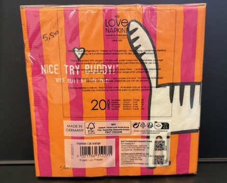 20 bedrukte papieren servetten in het formaat 33 x 33 cm of 16,5 x 16,5 cm (lunchformaat), 3-laags, materiaal: 100% tissue, lichtechte kleuren, chloorvrij gebleekt, FSC-gecertificeerd