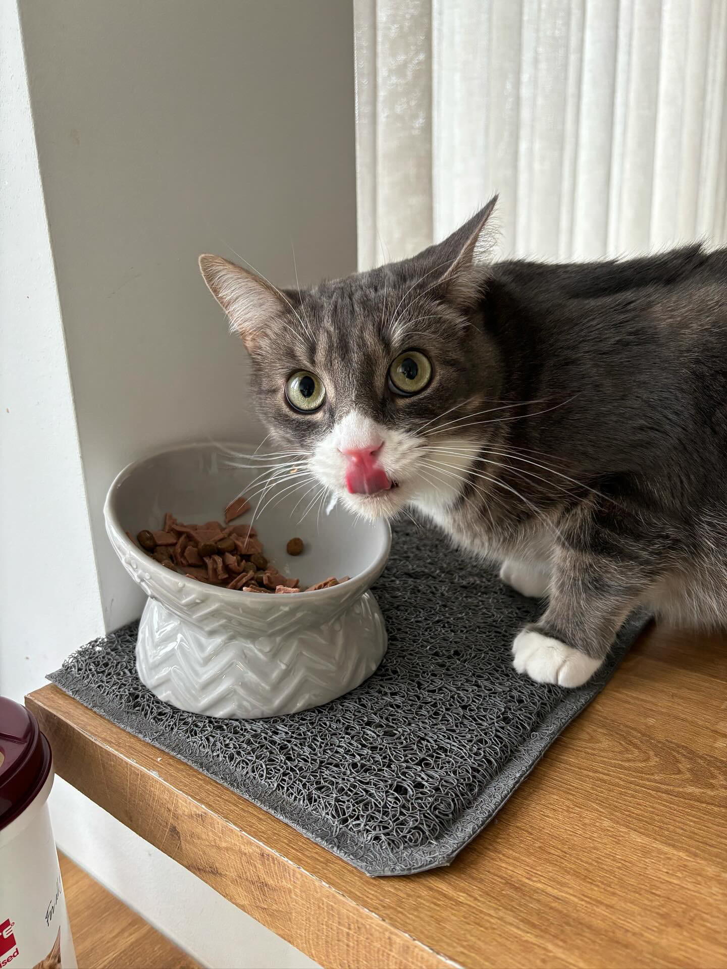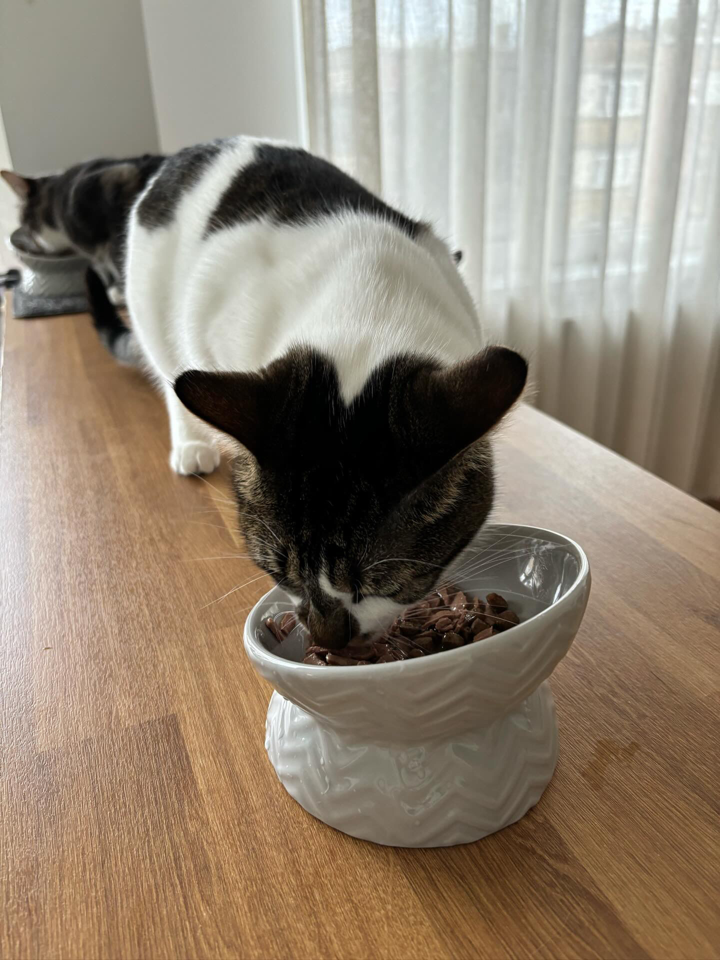 Deze verhoogde keramische voer- en of waterbak heeft een ergonomische vorm. Ideaal voor senior katten met gewrichtsproblemen (artrose, reuma,…) . Een verhoogde kom zorgt ervoor dat de kat zich niet moet forceren tijdens eten of drinken.